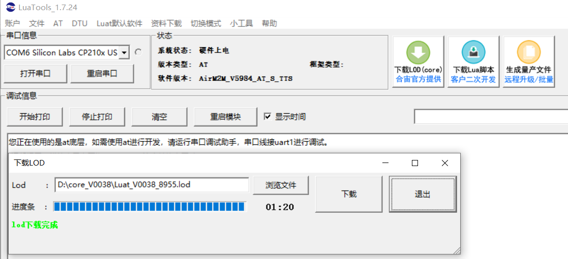 目录,可以根据需要直接点击跳转: [下载LuaTools工具](#下载LuaTools工具 "下载LuaTools工具") [2G模块烧写教程(Air2xx系列、Air8xx系列):](#2G模块烧写教程(Air2xx系列、Air8xx系列):) [刷入AT版本的lod](#刷入AT版本的lod) [刷入luat版本的lod](#刷入luat版本的lod) [下载lua脚本文件](#下载lua脚本文件) [4G Cat4模块烧写教程(Air720x系列)](#4G Cat4模块烧写教程(Air720x系列):) [安装驱动](#安装驱动) [下载AT版本的固件](#下载AT版本的固件) [下载LUAT底层固件](#下载LUAT底层固件) [烧录脚本文件](#烧录脚本文件) [烧录wifi固件](#烧录wifi固件:) [小工具](#小工具:) --- # 下载LuaTools工具 下载工具一般要经过以下步骤: 打开合宙官网:[http://www.openluat.com/](http://www.openluat.com/ "http://www.openluat.com/") 选择上面的“产品中心”,随便选一个产品,如:Air202 GPRS 通信模块 点击模块介绍那边的“资料下载”选项卡 点击“[LuaTools] Luat下载调试工具x.x.x”下载 下载后可能会进行自动升级,这个工具基本上是持续使用,都不会出现版本过旧的问题  ↑软件界面 --- # 2G模块烧写教程(Air2xx系列、Air8xx系列): (4G模块烧录方法请看往下翻,看下一部分) 这时候,我们只需要用usb转串口线,与给模块/开发板的HOST串口相连,GND相连,并给模块上点即可 >注意:模块的HOST口使用的是921600波特率,如果你使用的是劣质串口芯片(如质量差的pl2303以及山寨的ch340之类的),会出现无法通讯的现象。并且需要保证模块供电充足,不然会出现无限重启的状况。 ## 下载lod固件文件/更改AT和luat底层版本 lod文件相当于一个模块的底层部分,lod文件可以分为AT版与luat版 AT版只能使用AT命令对模块进行控制,AT串口为uart1口 luat版为运行lua脚本所使用的底层,可对模块内部进行片内编程,完成一部分或全部的本应由外接单片机完成的工作 ### 刷入AT版本的lod 刷入AT版本的固件十分简单,在上面连接模块完成之后,确保串口选项卡的串口为你设备的串口值,点击菜单中的AT–切换为标准的AT版本,如下图:  点击下载为模块烧入AT固件:    这样,AT版本固件的lod就烧录完成了。 ### 刷入luat版本的lod luat的固件因为需求不同,所以为了节省空间,提供了多种库的组合 luat的固件可以在下载工具目录的/LuaTools x.x.x/8955Lod/找到,每个版本的区别可以参考readme.txt文件中的描述,部分内容也贴在下面: ``` Luat_VXXXX_8955.lod:不支持SSL、TTS、SPI接口的LCD功能 Luat_VXXXX_8955_SSL.lod:支持SSL功能 Luat_VXXXX_8955_SSL_TTS.lod:支持SSL、TTS功能,不支持MP3、MIDI、录音功能 Luat_VXXXX_8955_SSL_UI.lod:支持SSL、SPI接口的LCD功能 Luat_VXXXX_8955_TTS_UI.lod:支持TTS、SPI接口的LCD功能 Luat_VXXXX_8955_TTS1.lod:支持TTS功能 Luat_VXXXX_8955_TTS2.lod:支持TTS功能、不支持MP3、MIDI、录音、json Luat_VXXXX_8955_UI.lod:支持SPI接口的LCD功能 Luat_VXXXX_8955_SSL_FLOAT.lod:支持SSL功能、浮点数 Luat_VXXXX_8955_SSL_UI_FLOAT.lod:支持SSL功能、PI接口的LCD功能、浮点数 Luat_VXXXX_8955F.lod:64M flash版本(Air202F),支持SSL、TTS、SPI接口的LCD功能 ``` 我以烧录最基本的Luat_VXXXX_8955.lod为例,首先在调试工具中确保串口选项卡的串口为你设备的串口值,点击下载LOD(core)按钮,选中之前在工具目录的lod文件:  选中确认无误后,点击下载进行写入lod的操作    ### 下载lua脚本文件 由于luat模块的特色就是lua二次开发,所以下载烧录脚本的方法也是必须掌握的,下面以烧录S9开发板的示例程序为例(S9就是那个板载usb的开发板) lib库已在luatools中自带,无需再自己下载 ### 烧录S9需要的底层lod文件 S9需要的底层lod是`Luat_VXXXX_8955_UI.lod`,这里的UI库包含了字库和各种SPI、I2C屏幕的驱动 烧录步骤不再重复,请确保烧录最后成功了 ### 烧录lua脚本 lua脚本分为两部分:一个部分是官方写的lib库文件(library),另一部分是用户自己的脚本文件。一般lib的文件不用去修改,除非有特殊需求。 >lua库分为两个版本: 一个是老的script, 另一个是由稀饭放姜进行编写的script_LuaTask库 >现阶段建议新项目都用script_LuaTask进行编写;老用户使用了script编写的,如码夫支付模块,可以继续用老版本,没有任何影响。 这里烧录的S9开发板就是使用的script_LuaTask进行编写的,具体步骤如下: 点击下载lua脚本按钮,将文件列表全部清空:  点击添加脚本,将刚刚从git仓库下载的Luat_2G_RDA_8955/script_LuaTask/product/LuatBoard_Air202/demo下的所有文件全部选中,点击打开确认选中 > 这里如果没有选择lib文件,工具会自动进行提示 点击下载,会弹出对话框让你补全lib库文件,这里我们选择“优先推荐”的LuaTask库,点击确定:   最后,等待下载成功即可  关闭对话框,即可看到设备运行的trace信息,这个信息会在下一章进行解释:  # 4G Cat4模块烧写教程(Air720x系列): 这里我们使用Air720开发板(S720 Border)作为演示,首先需要将开发板按如下方式连接电脑:  连接后,我们会在设备管理器看到有几个未安装的驱动,我们需要安装上这些驱动 ## 安装驱动  >对于win8/win8.1/win10电脑,在安装驱动前需要进行如下操作(win7可以跳过该部分直接安装驱动): win8:在桌面右侧点击弹出菜单中的“设置”,点击“更改电脑配置”,在左侧点击“通用”,接着点击右侧“高级启动”中的“立刻重启”按钮 win10:按下win+i快捷键,点击“更新和安全”--“恢复”--“高级启动”下的“立即重启”按钮 >接着就进入了高级启动界面,选择“疑难解答”--“高级选项”--“启动设置”--“重启” 在启动设置页按F7选择禁用驱